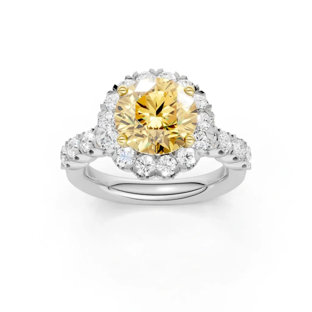 The prominent round fancy yellow diamond at the center of this stunning piece offers a striking contrast against the clear diamonds and white gold setting. This unique design solves the problem of finding an eye-catching ring that doesn’t sacrifice on quality or ethics.