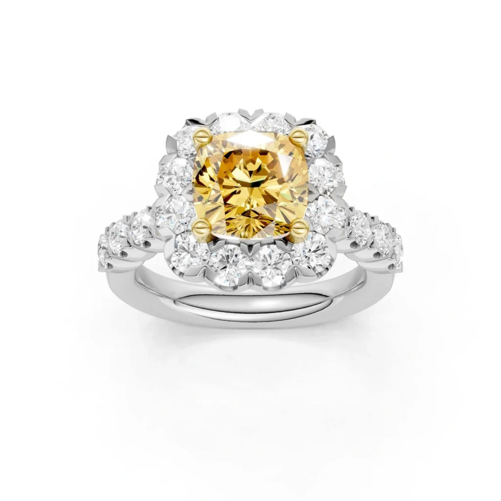 Discover the epitome of elegance and luxury with our 14kt white gold lab grown IGI certified diamond halo engagement ring. This exquisite piece boasts a vibrant, fancy yellow, lab-grown center diamond weighing in at 2.06cts.