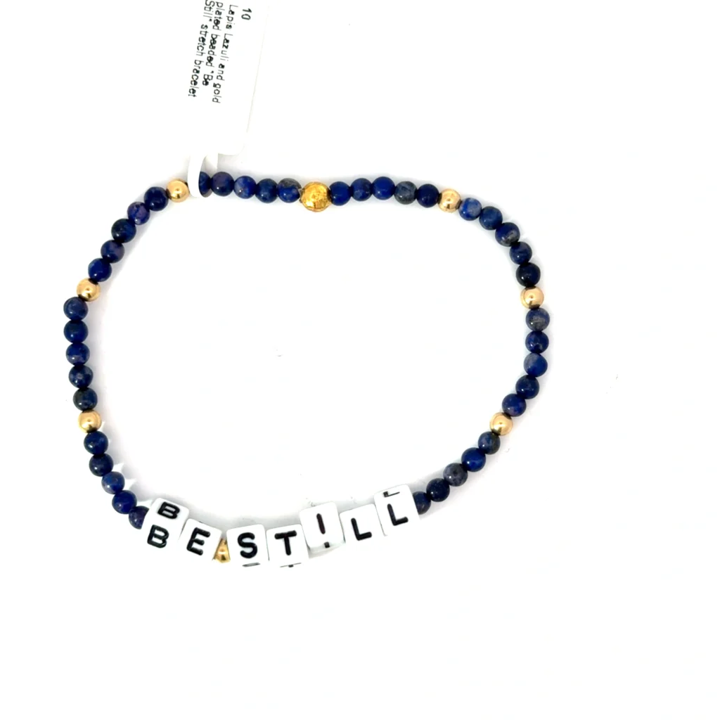 “Blue Lapis Lazuli beads strung with gold-plated accents featuring a ‘Be Still’ charm, assembled in a stretchable, plush bracelet.”