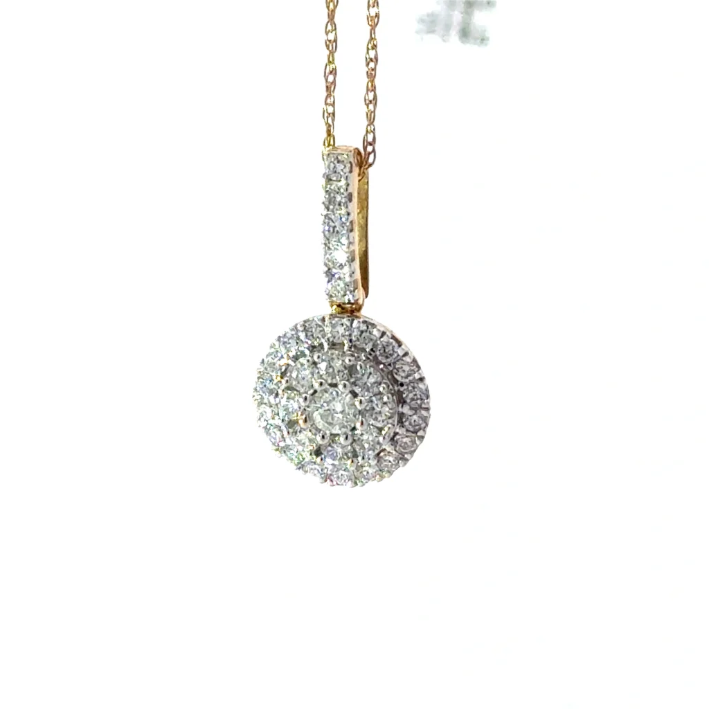 The elegant 14kt yellow gold pendant is a testament to the skill and artistry involved in jewelry creation. Crafted from high-quality 14kt yellow gold, its warm hue complements the brilliant sparkle of the diamond halo cluster, presenting a harmonious balance of color and shine. The diamond, at 0.50 carats, with a clarity rating of SI1 and a G color grade, ensures a stunning appearance that catches and reflects light beautifully. This attention to quality guarantees that the pendant not only looks exquisite but also maintains its allure through everyday wear.