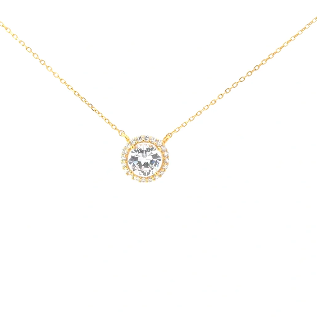 This is a luxurious Sterling Silver necklace, draped in a warm gold tone. Its centerpiece is a captivating halo-shaped cubic zirconia pendant. The necklace features an adjustable chain, allowing a personalized fit for any neckline.