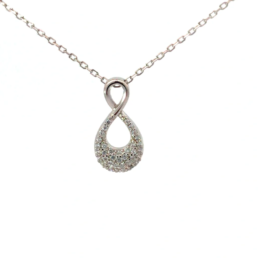 This stunning Sterling Silver fashion necklace features a dazzling CZ pave infinity pendant. Its adjustable chain allows customizable fit, enhancing its elegance. A timeless accessory, it effortlessly marries luxury and style for an exquisite statement piece.