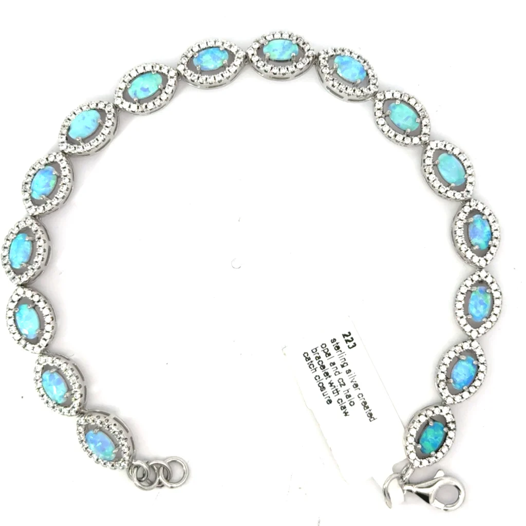 An elegant sterling silver bracelet, featuring a radiant created opal, is more than just an accessory; it is a statement of grace and sophistication. With its stunning central opal encased in a halo of sparkling cubic zirconia, this bracelet effortlessly complements both formal attire and casual ensembles, adding a touch of glamour to your look. Its versatility makes it an ideal piece for those who seek to express their unique style through timeless jewelry.