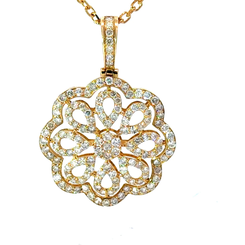 Discover the allure of our womens diamond chains, a perfect blend of sophistication and timeless beauty. Each piece is meticulously crafted to ensure you shine with every step you take. Our exquisite 14kt yellow gold pendant, adorned with 1.90ct SI1, G/H diamonds, is intricately woven in a fancy filigree design on an 18″ cable chain. This luxurious necklace is more than just an accessory; it’s a statement of elegance and class.