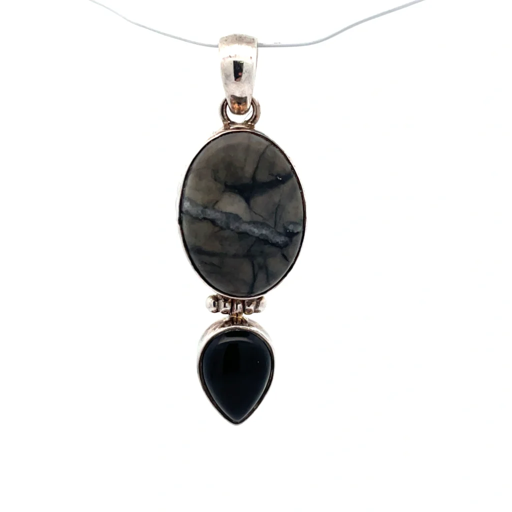 Be the first to review ““Handcrafted sterling silver pendant from Bali, Indonesia, featuring an oval Picasso rock centerpiece surrounded by onyx detailing.”” Cancel reply