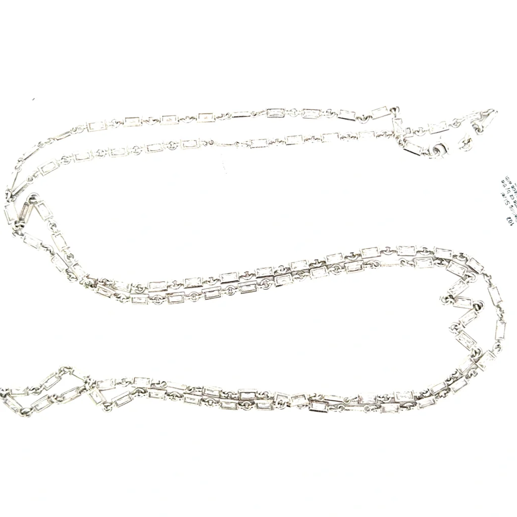 A 36″ sterling silver necklace featuring baguette-cut cubic zirconia spaced evenly, secured with a stylish claw catch clasp.