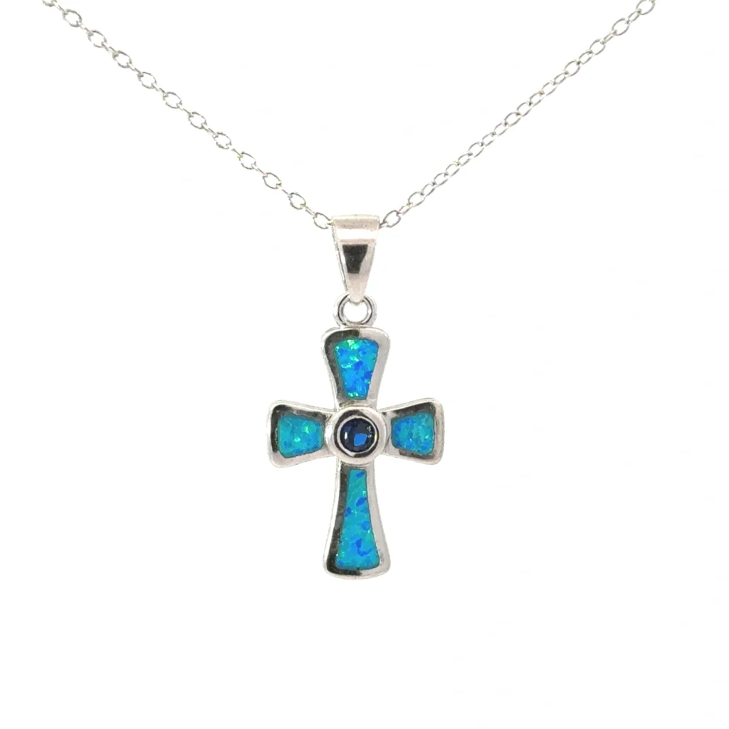 HomeJewelryNecklacesReligiousA sterling silver cross pendant featuring a radiant blue opal center and imitation tanzanite accents on a rhodium-plated 18″ chain.
