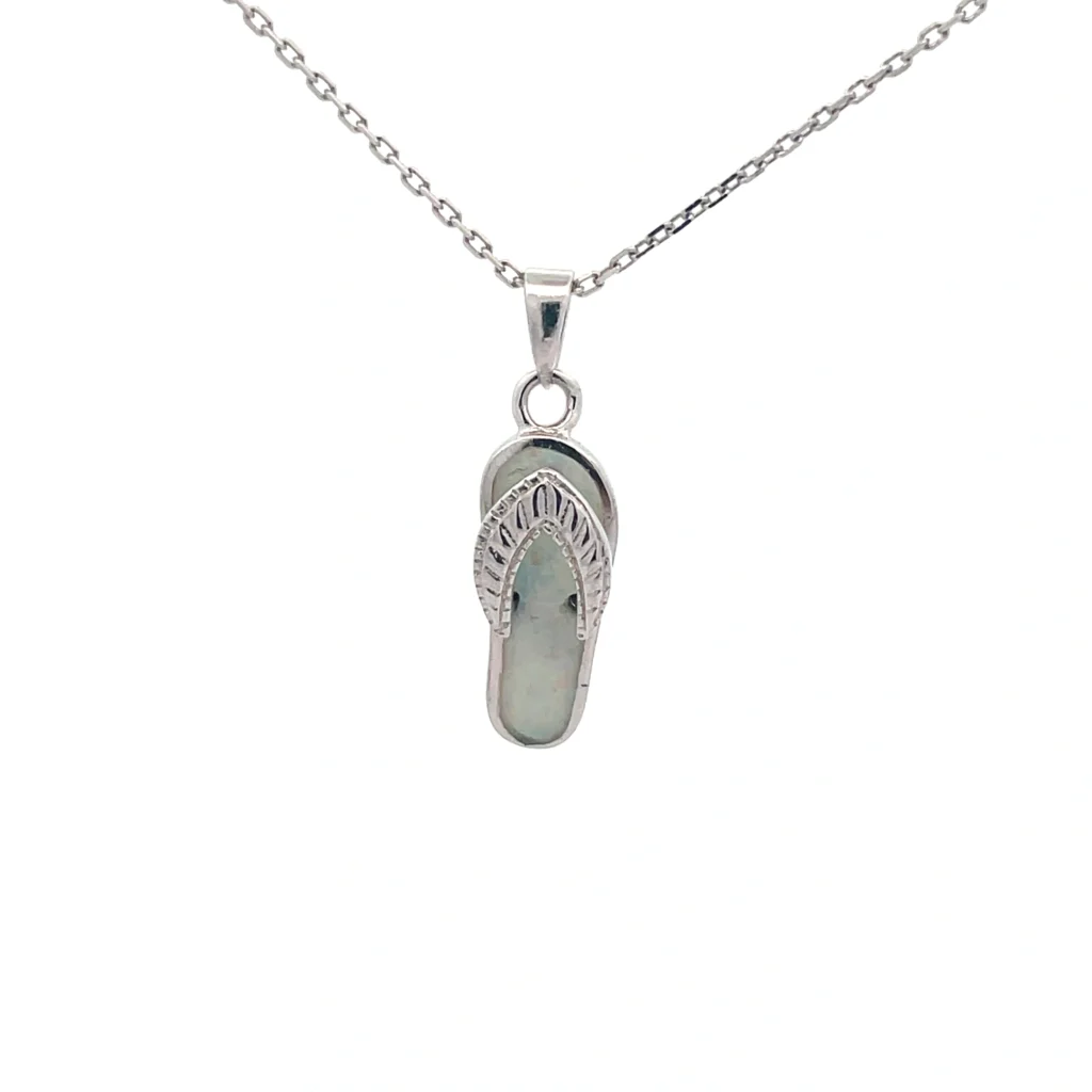 Be the first to review “An elegant Sterling Silver rhodium-plated pendant with an 18″ chain, featuring a whimsical flip flop design adorned with created white opal.” Cancel reply