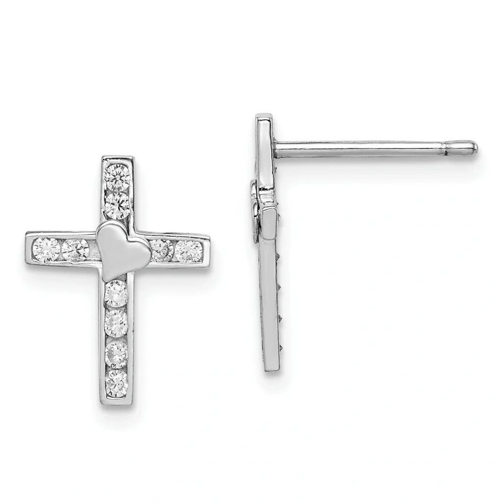 HomeJewelryEarrings“Charming child’s earrings featuring rhodium-plated sterling silver crosses and heart-shaped cubic zirconia. Elegant and age appropriate.”
