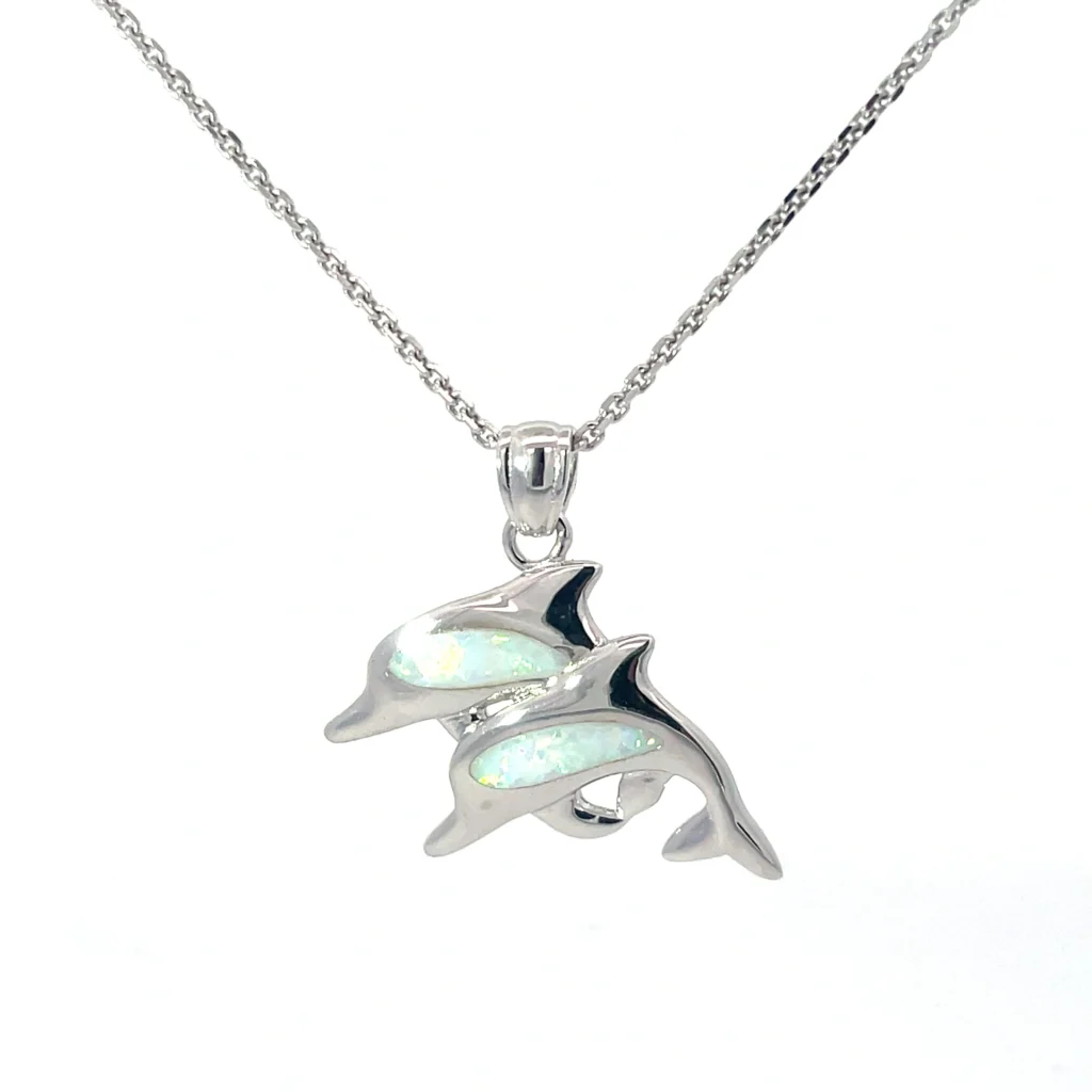 Dazzling sterling silver pendant featuring two dolphins accented with created blue opal on 1.4mm 18″ diamond cut cable.