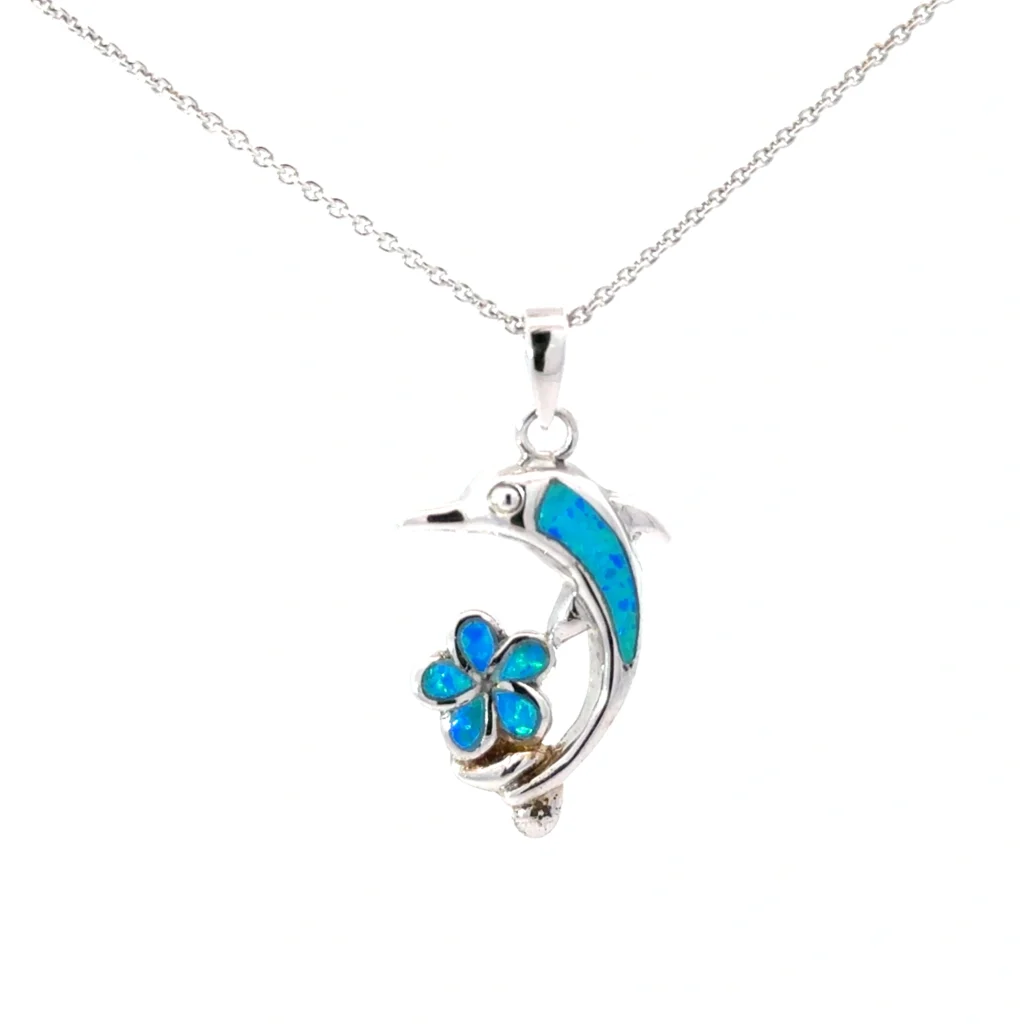 Delicate sterling silver pendant featuring a blue opal dolphin and flower, adorned on an 18" rhodium plated claw link chain.