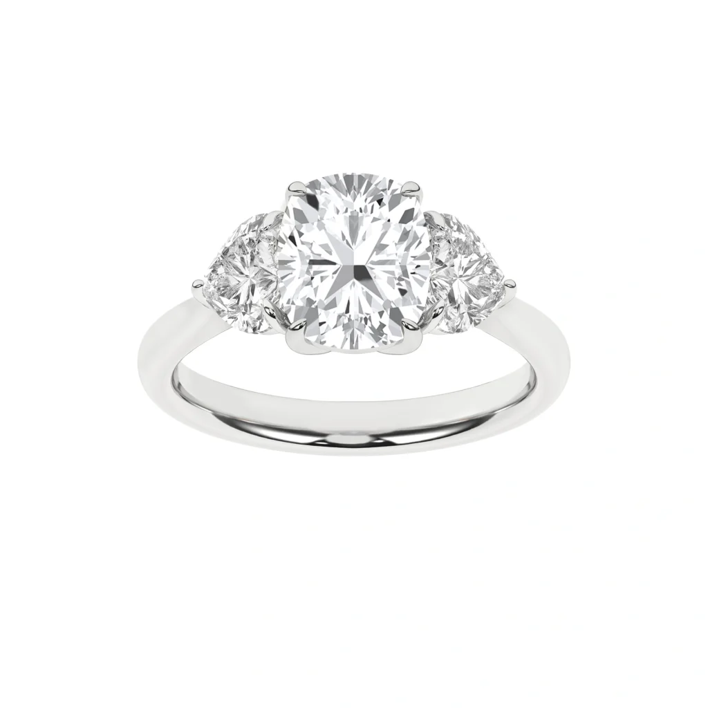HomeEngagement Rings3 StonePlatinum GIA lab grown certified elongated cushion C 2.06cts with heart side stones tw 3.13cts VS, colorless F color