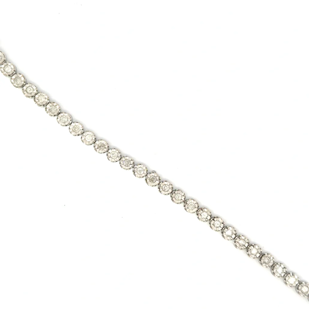Elegant 10kt white gold tennis bracelet featuring 2.00cts I1 clarity, I/J color diamonds, illusion set with a foldover safety clasp.