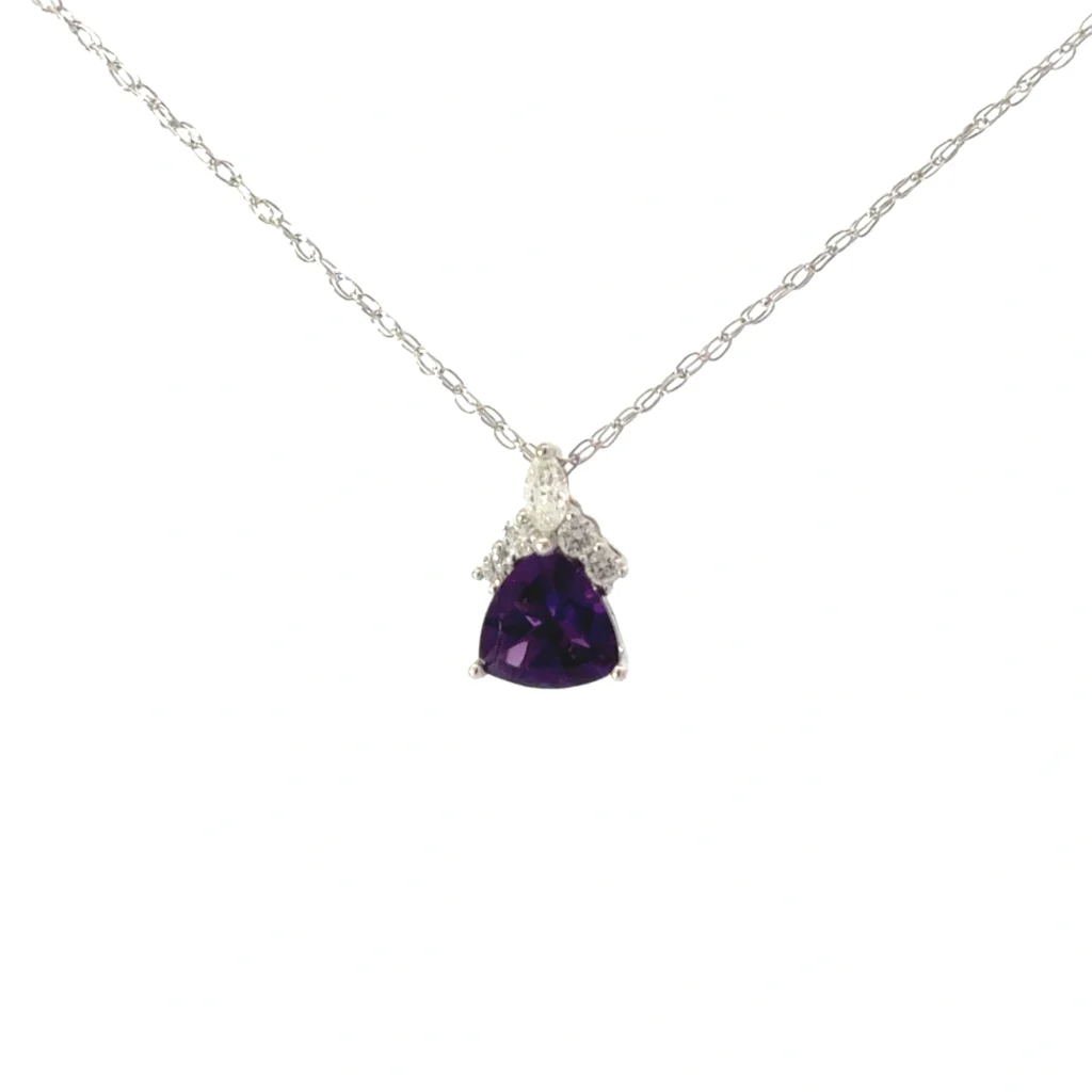 Expertly crafted with an eye for sophistication, this elegant 14kt white gold pendant enhances any wardrobe. The gleaming chain, sized perfectly at 18 inches, ensures the pendant rests gracefully against the collarbone, making it an ideal choice for both daytime elegance and evening allure. The captivating 1.20-carat amethyst provides a rich and vibrant pop of color, known for symbolizing clarity and calmness. Surrounding this mesmerizing center stone, the 0.23 carats of SI, H/I-grade diamonds add an extra touch of brilliance, catching the light with each movement and illuminating the elegance inherent in every detail.