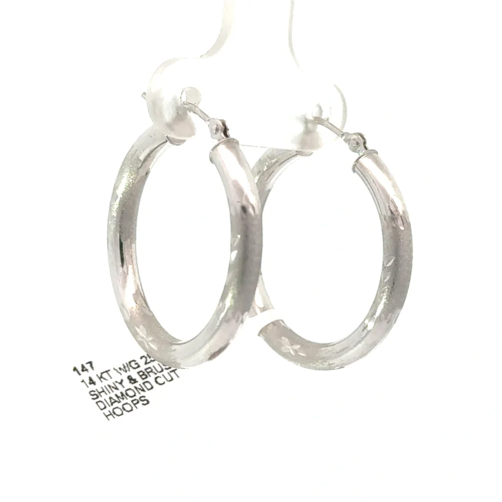 Be the first to review “Elegant 14KT white gold 25mm hoops, featuring shiny, brushed surfaces and expertly crafted diamond cut details for added sparkle.” Cancel reply