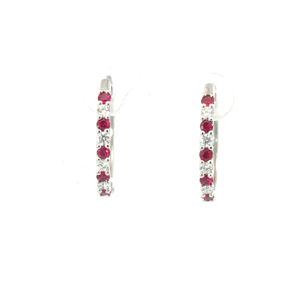 Crafted with precision, these diamond hoop earrings are made from high-quality 14KT white gold, known for its durability and timeless appeal. The combination of diamonds and rubies not only enhances the beauty of the earrings but also ensures they remain a treasured piece for years to come.