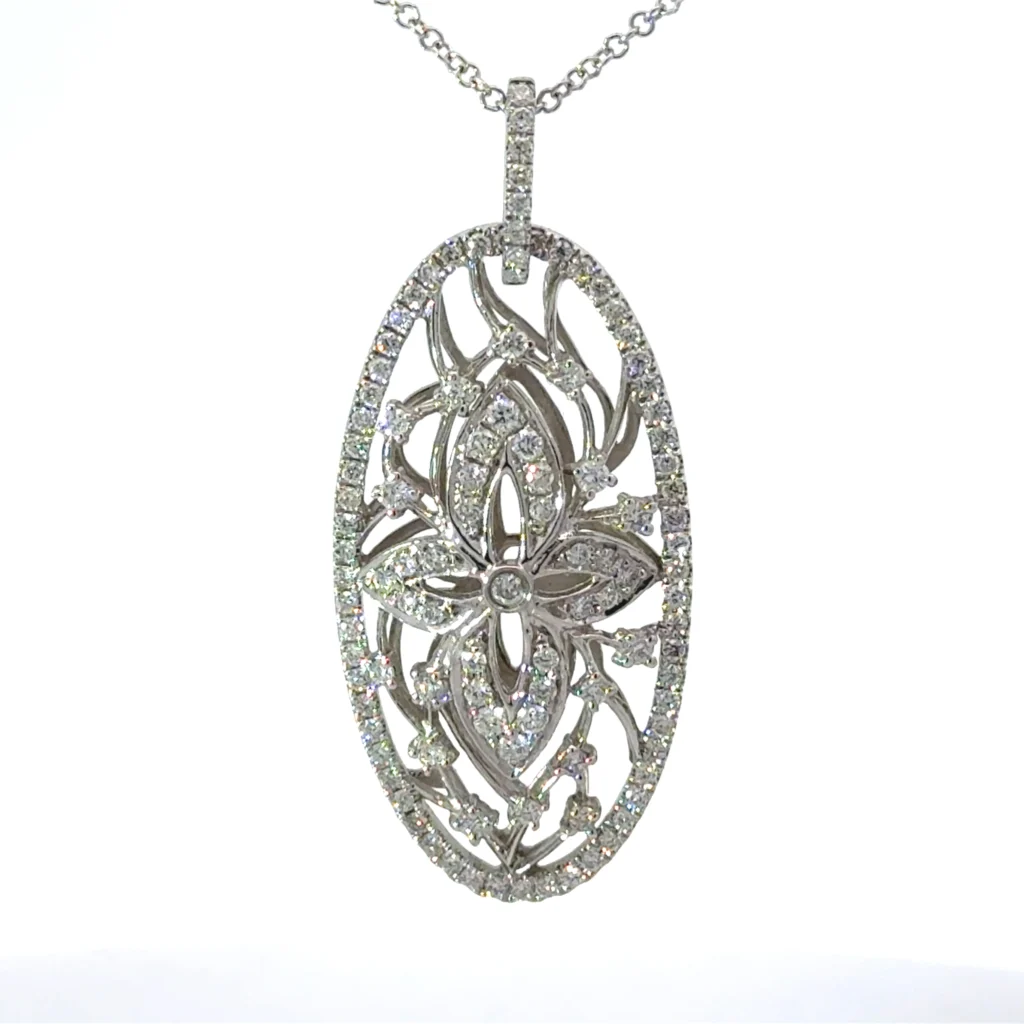Discover the allure of timeless necklaces with our Elegant 14kt White Gold Antique-Style Pendant, featuring a magnificent 1.00cts SI1, H grade diamond. This exquisite piece is suspended on an 18-inch cable chain, making it a must-have addition to any jewelry collection. Whether you’re searching for a perfect gift or a statement piece for yourself, this pendant embodies sophistication and heritage.