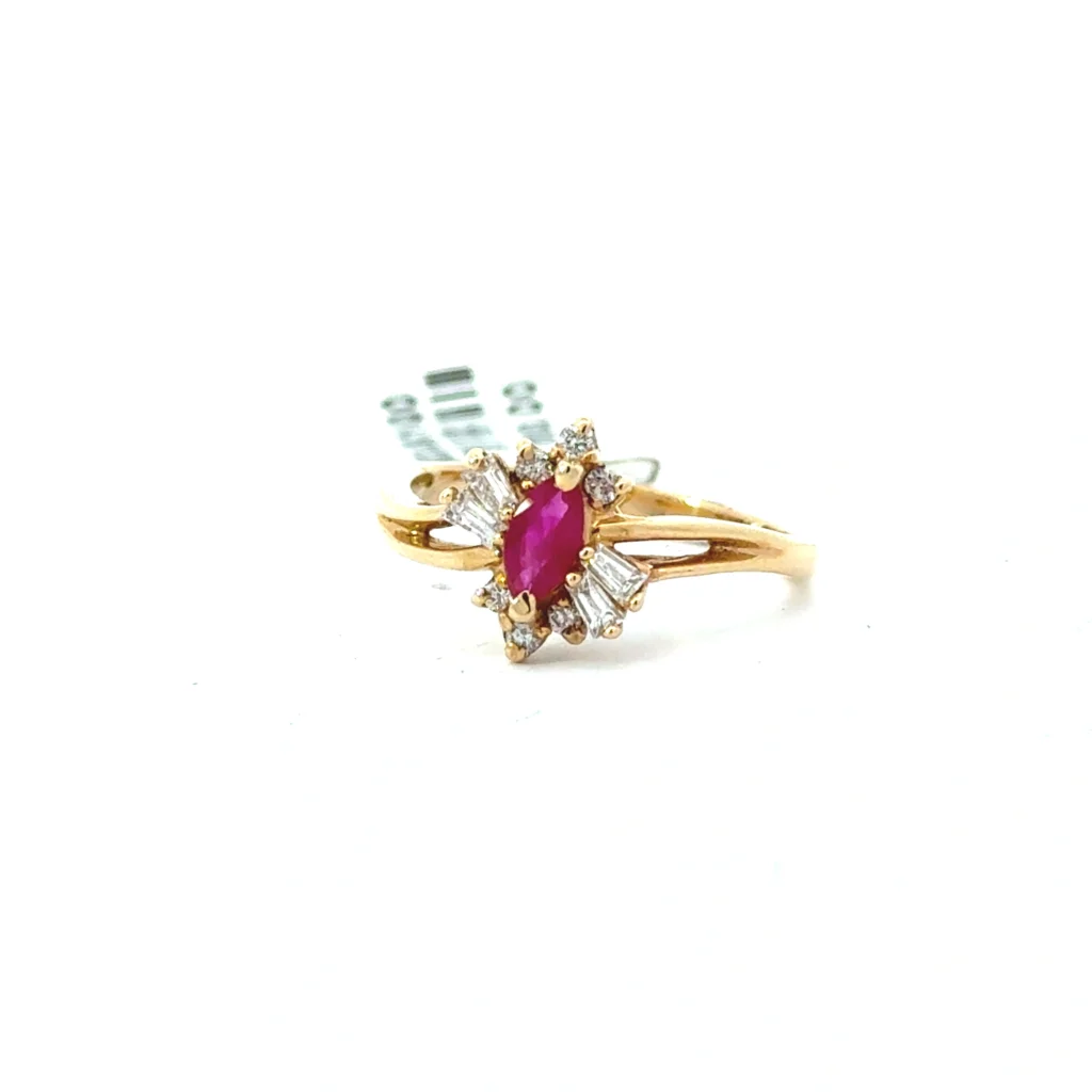 This ring is a stunning piece crafted from 14kt yellow gold, showcasing a radiant 6×3 ruby, framed by four baguette-cut diamonds (2.5×1.5×1, 0.16pt), and six round-cut diamonds (0.09pt) for added sparkle and elegance.