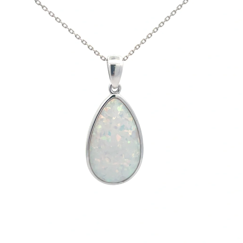 Elegant 18″ rhodium plated sterling silver pendant featuring a lustrous white, pear-shaped, created opal on a dc link chain.