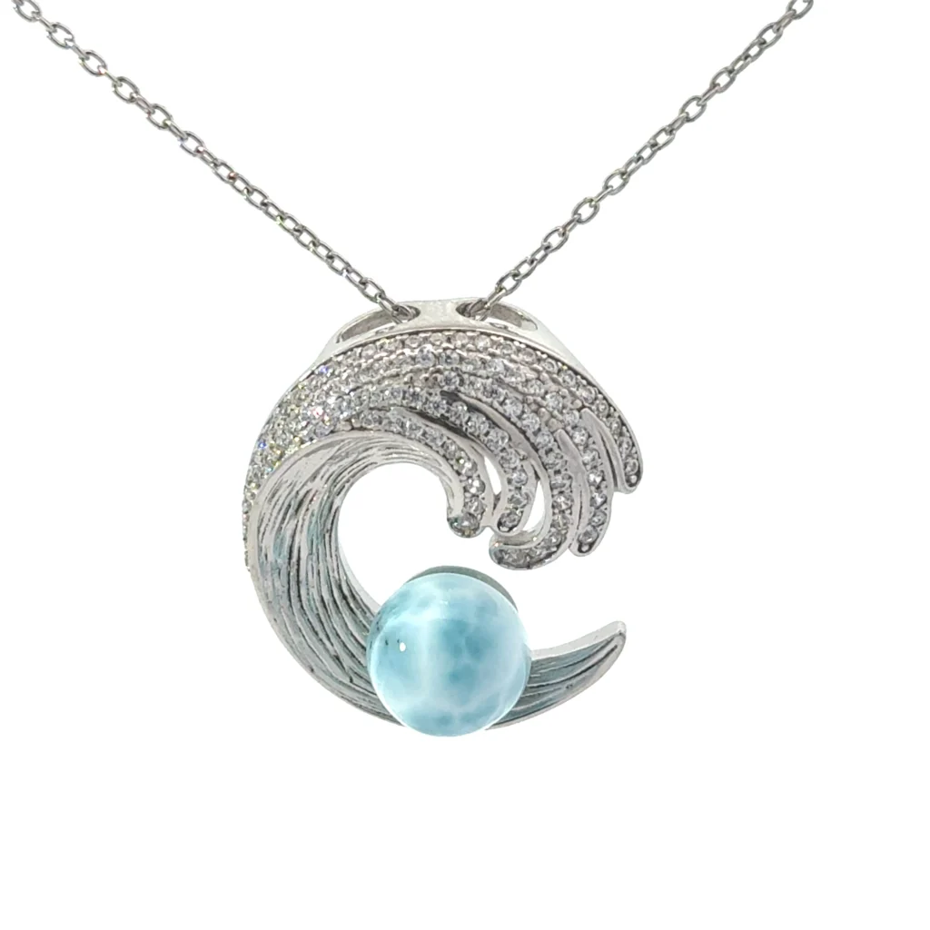 Be the first to review “Elegant 18″ sterling silver necklace featuring a petite larimar stone, CZ embellished wave ball on a durable cable link chain.” Cancel reply