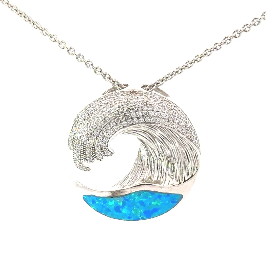 Elegant 18″ sterling silver necklace featuring a white opal wave pendant, suspended on a cable chain with a claw catch.