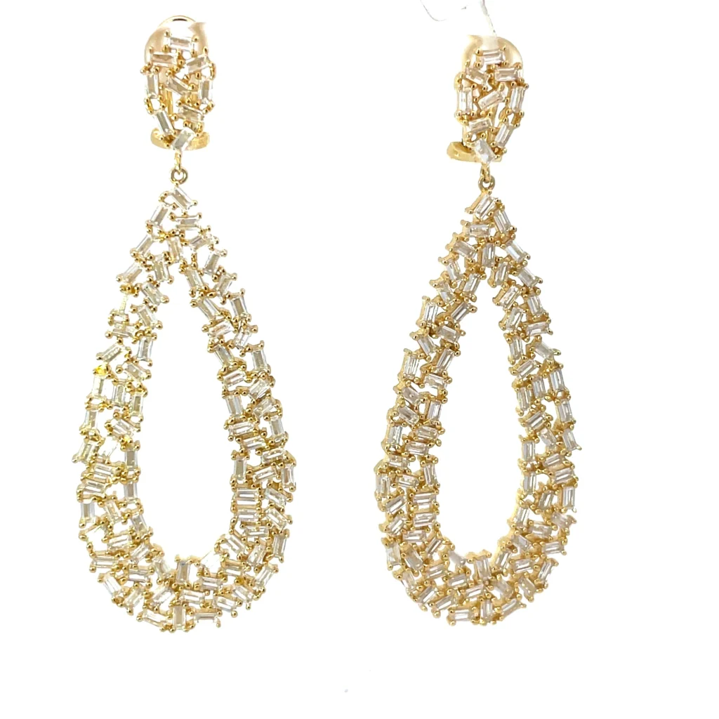Be the first to review “Elegant gold-plated Sterling Silver earrings, featuring glittering CZ baguettes and pear-shaped dangles with secure omega backs. Luxuriously fashionable.” Cancel reply
