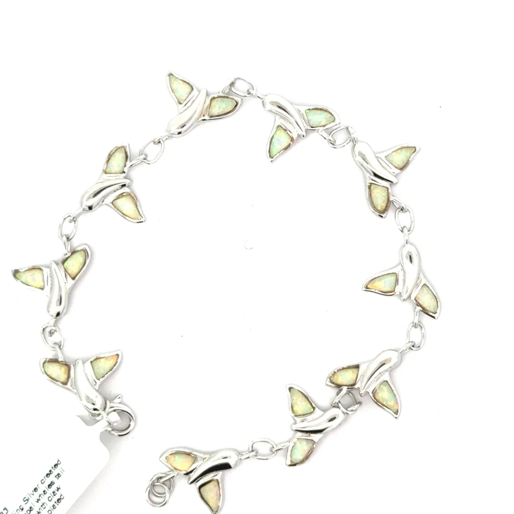The bracelet features a charming whale’s tail design, inlaid with striking created blue opal. This unique design element sets it apart from other ladies bracelets, making it a standout piece in any collection.
