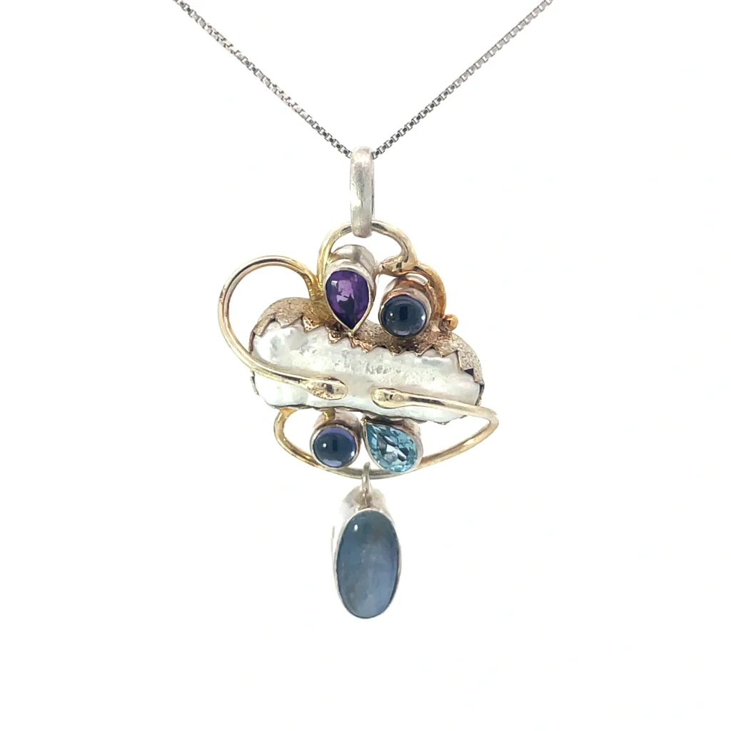 Elegant sterling silver 22kt vermeil freeform pendant featuring pearl, blue topaz, kayanite, amethyst on a dainty box chain.