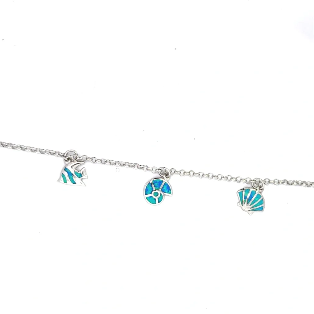 Discover the perfect addition to your jewelry collection with our elegant sterling silver bracelet, featuring four dangling sea life charms beautifully adorned with created blue opal accents. This bracelet for women is designed to bring a touch of sophistication and a hint of the ocean’s charm to your ensemble.