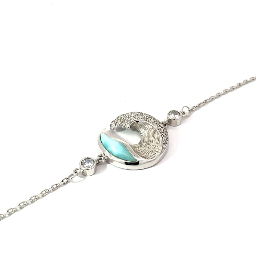 Be the first to review “Elegant sterling silver bracelet featuring larimar and CZ wave design, complete with adjustable chain and secure claw catch closure.” Cancel reply