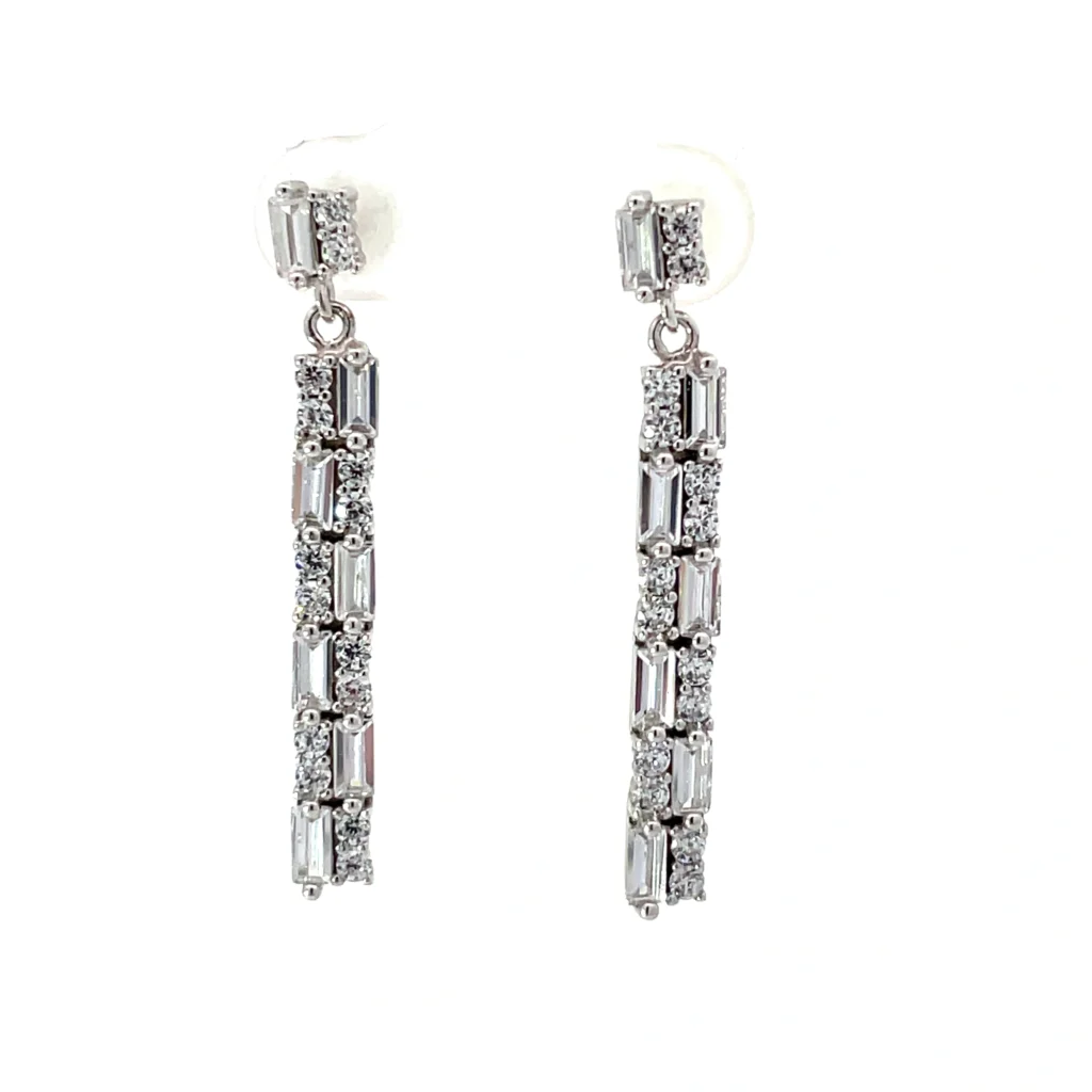 Elegant sterling silver dangle earrings featuring alternating baguette and round-cut gems for a classic, sophisticated sparkle.