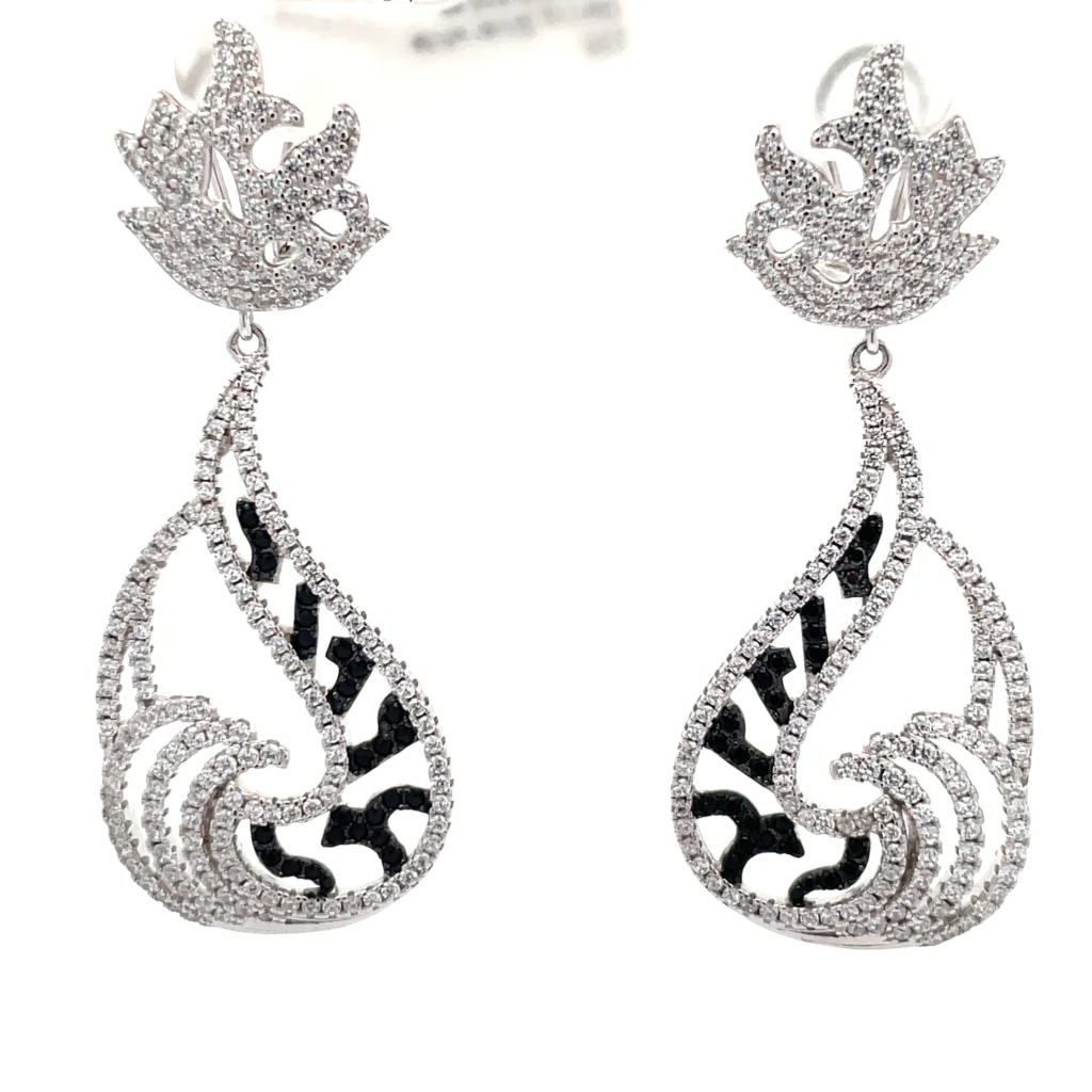 These Sterling Silver fashion earrings feature captivating dangle designs with striking white and black cubic zirconias. They are secured with robust Omega backs, exuding a blend of elegance and contemporary style.