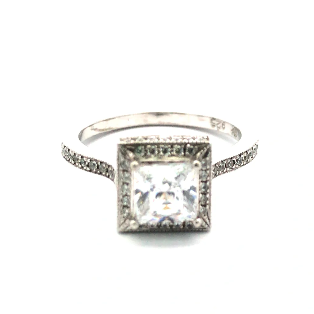 Elegant sterling silver engagement ring, adorned with sparkling cubic zirconia, showcasing timeless design and outstanding craftsmanship.