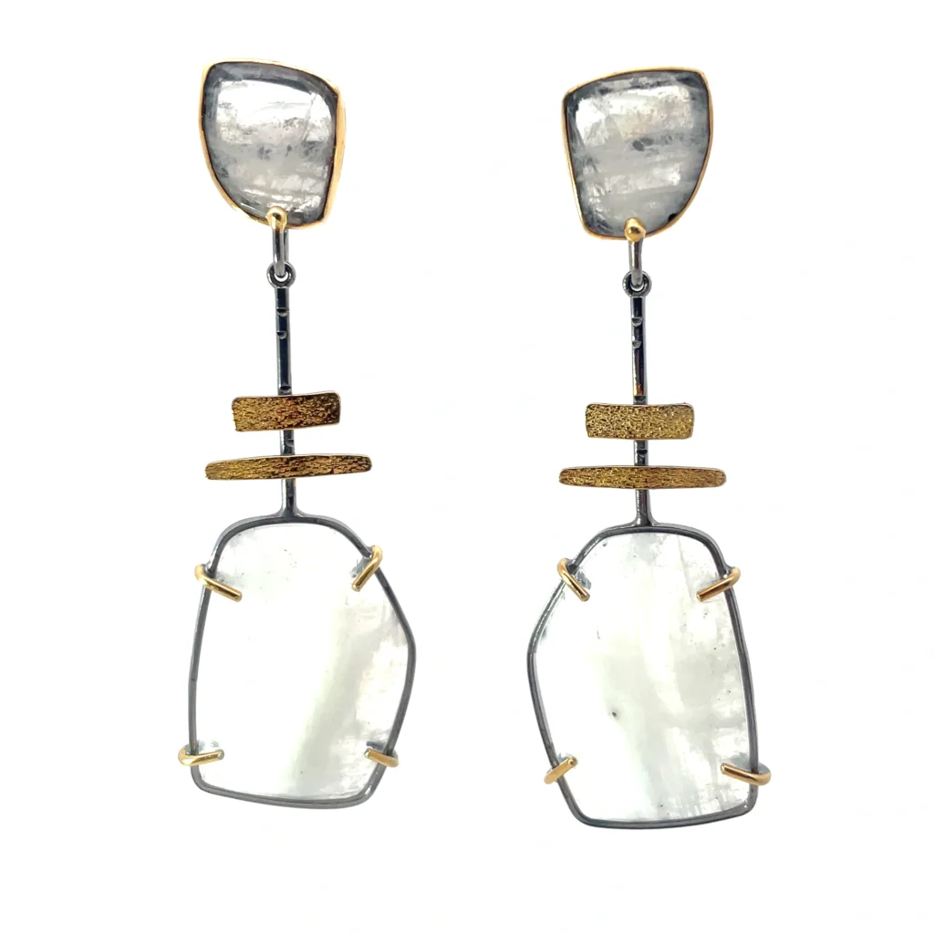 Elegant sterling silver gold-plated one-of-a-kind dangle earrings featuring ethereal moonstones and shimmering black rhodium accents.