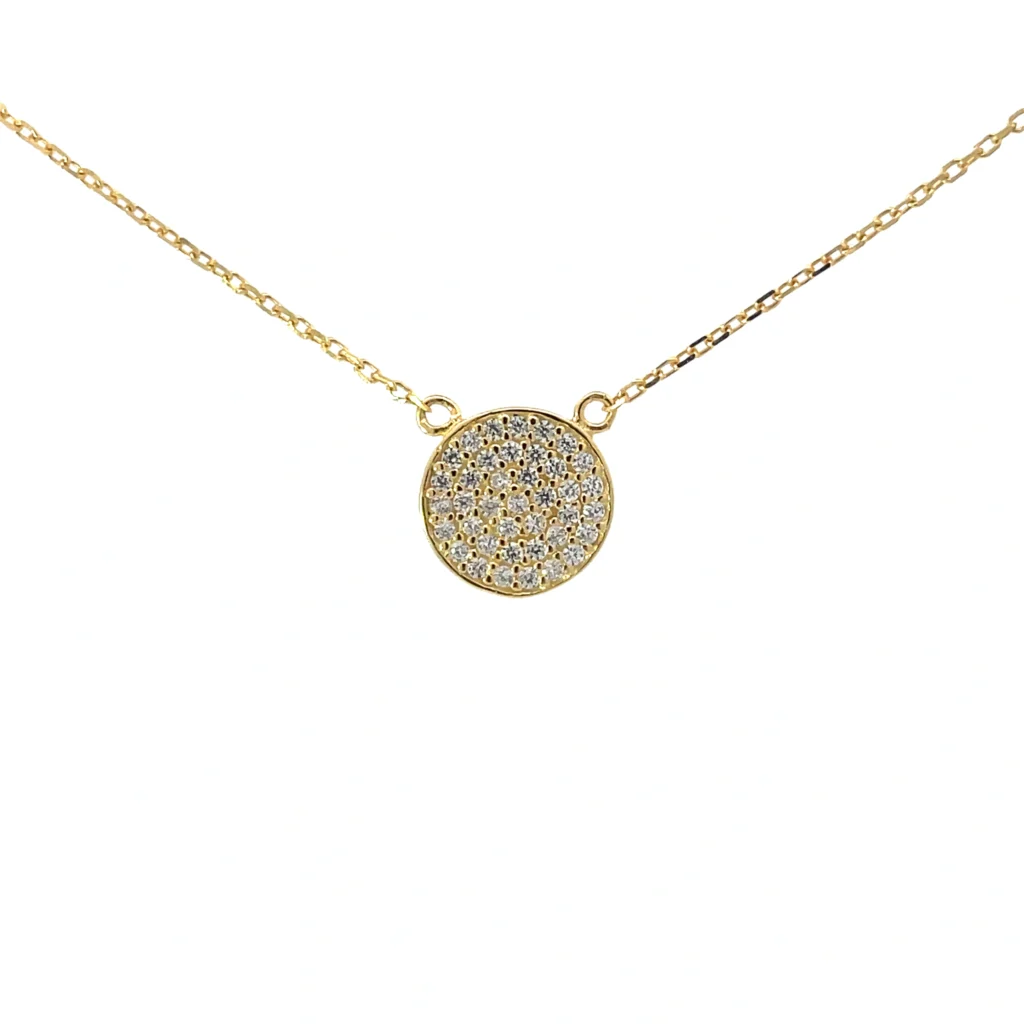 Our elegant women’s necklaces are designed to complement a wide range of styles. The gold-tone pave disc adds a touch of sparkle, while the sterling silver chain provides a classic backdrop. This versatile piece can be worn alone for a minimalist look or layered with other necklaces for a trendy, stacked effect.