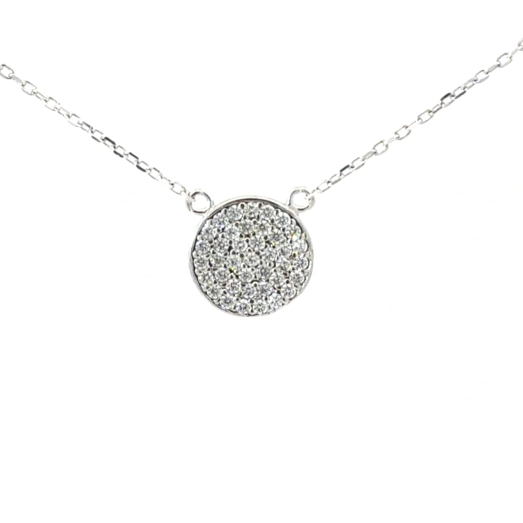 Welcome to M.S. Brown Jewelers, where sophistication meets style. Our womens sterling silver necklace is not just a piece of jewelry; it’s an embodiment of elegance and grace. Crafted from high-quality sterling silver and adorned with dazzling cubic zirconia (CZ) stones in a pave circle design, this pendant is perfect for any occasion. Whether you’re dressing up for a night out or adding a touch of sparkle to your everyday attire, this necklace is your go-to accessory.