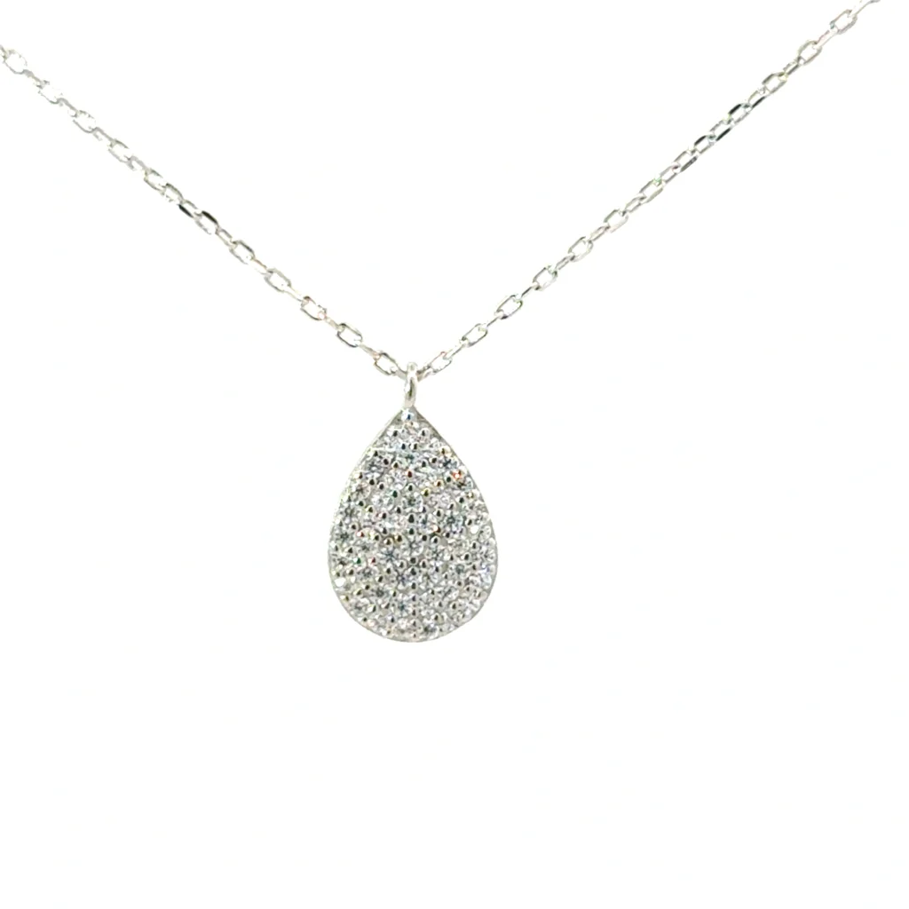 At M.S. Brown Jewelers, we take pride in offering timeless necklaces that exude elegance and sophistication. Our Elegant Sterling Silver Pendant, shaped like a pearl and encrusted with cubic zirconia, is designed to be the perfect accessory for any occasion.