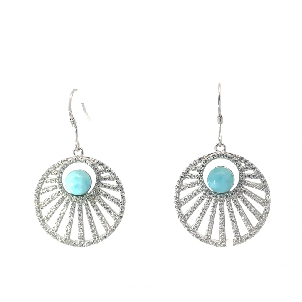 Elegant sterling silver sunburst earrings featuring genuine larimar stones, beautifully dangled and plated with radiant rhodium for an exquisite finish.