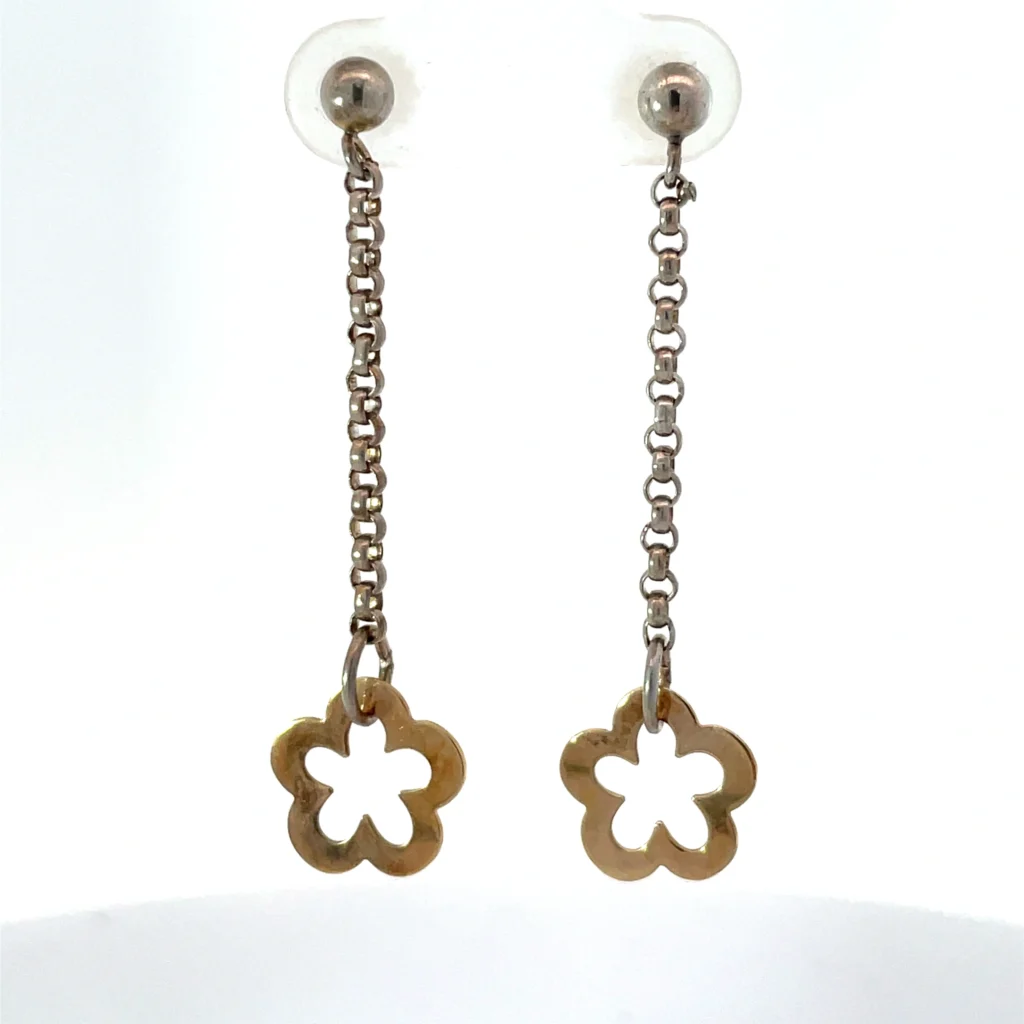 These exquisite 14kt flower dangle earrings are a testament to the harmony of intricate design and luxurious craftsmanship. Each pair is meticulously crafted to balance elegance and modernity, featuring not just one but multiple chain types. The blend of the 14kt gold chains holding the delicately detailed flowers and the contrasting sterling silver chains provides a captivating movement and sparkle. The use of stainless steel ensures durability and resilience, making these earrings suitable for both special occasions and everyday wear. Chains types is a key part of what we offer here.