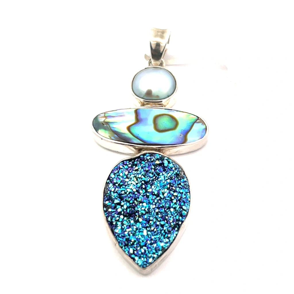 Exquisite handcrafted Sterling Silver pendant from Bali, featuring luminous druzy, mother of pearl, and vibrant abalone details.