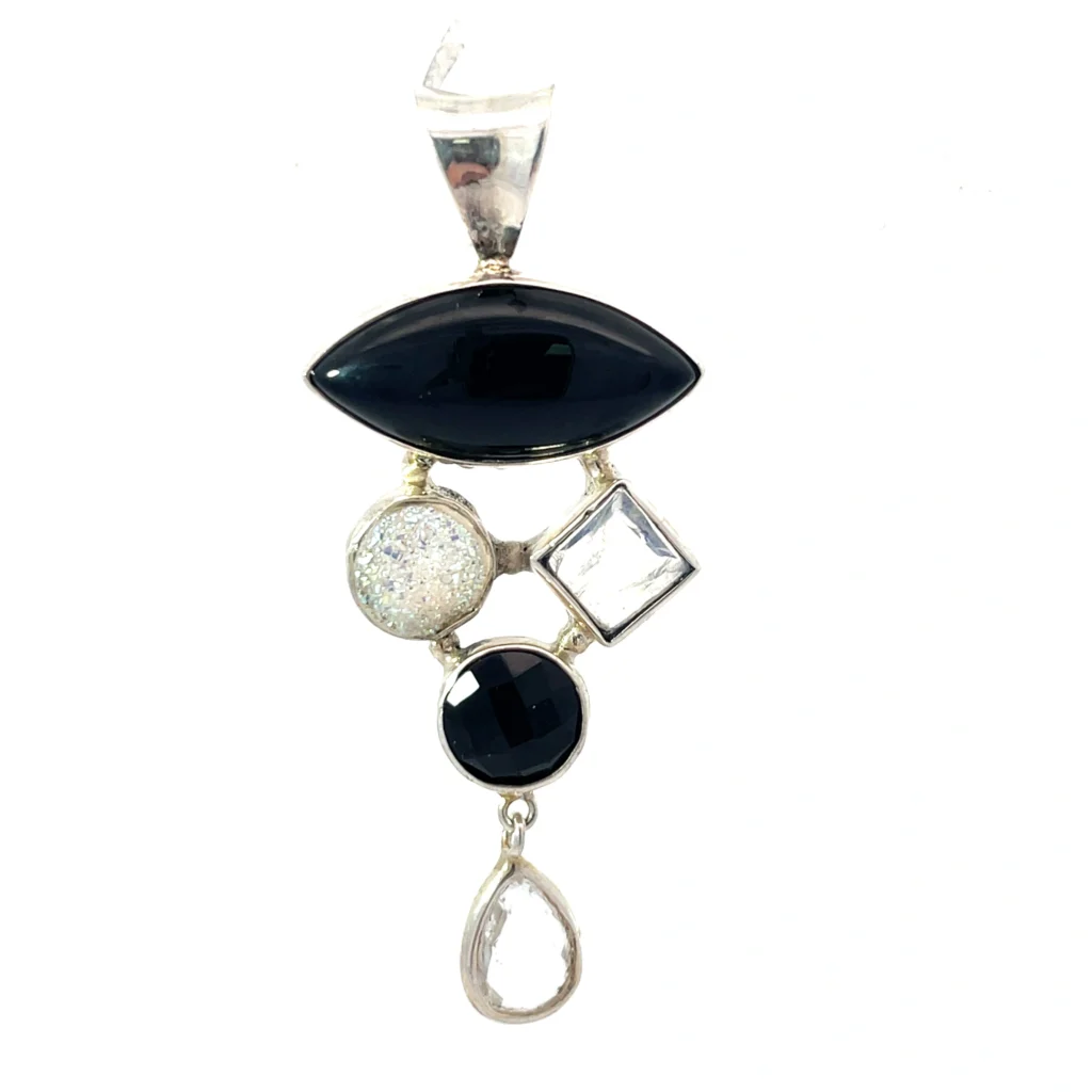 This handcrafted pendant combines genuine onyx, druzy, and moonstone, set in sterling silver. Showcasing the intricate artistry of Bali design, it exudes a timeless elegance perfect for enhancing any outfit. Expertly hand-polished for a mesmerizing sparkle.