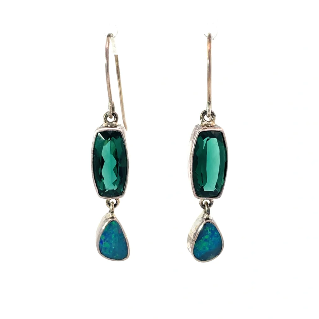 The opal stones in these glistening sterling silver dangle earrings provide a mesmerizing play of color that shifts with the light, creating a unique and dynamic look. This natural phenomenon, called ‘opalescence’, adds an enchanting aura to the earrings, making them ideal for both everyday wear and special occasions. Set against the gleaming sterling silver backdrop, both the quartz and opal stand out, creating a harmonious blend of elegance and vibrancy.