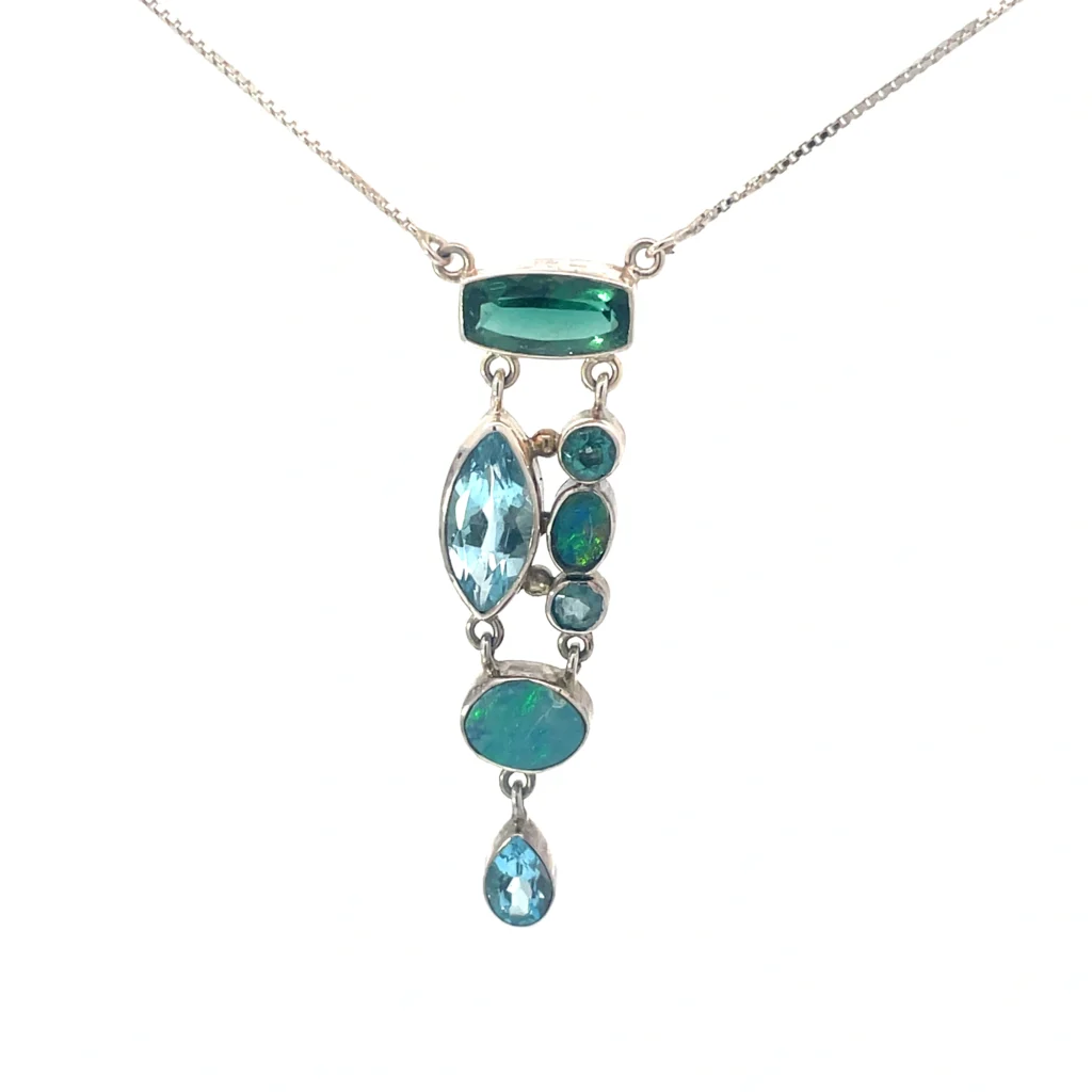 Handcrafted Sterling Silver Bali necklace features freeform opal, blue topaz and green quartz, with an adjustable length for versatility.