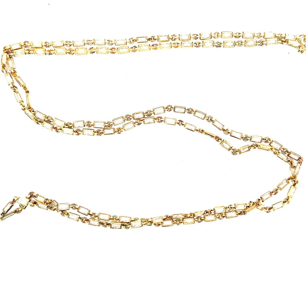 A luxurious 36″ Sterling Silver necklace, tastefully gold-plated and adorned with radiant baguette diamonds in a by-the-yard style.