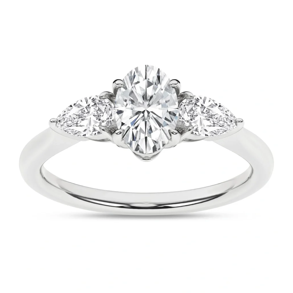 The side stones, two meticulously crafted pear-shaped diamonds, enhance the ring’s elegance. They too boast a colorless F+ rating and VS+ clarity, augmenting the centerpiece without overshadowing it.